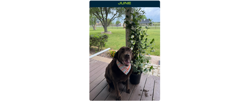 I have a Chocolate Lab named June. She will be nine years old this summer. She loves to be around people and brings joy to anyone she meets. Some of her favorite things to do are eat and sleep.