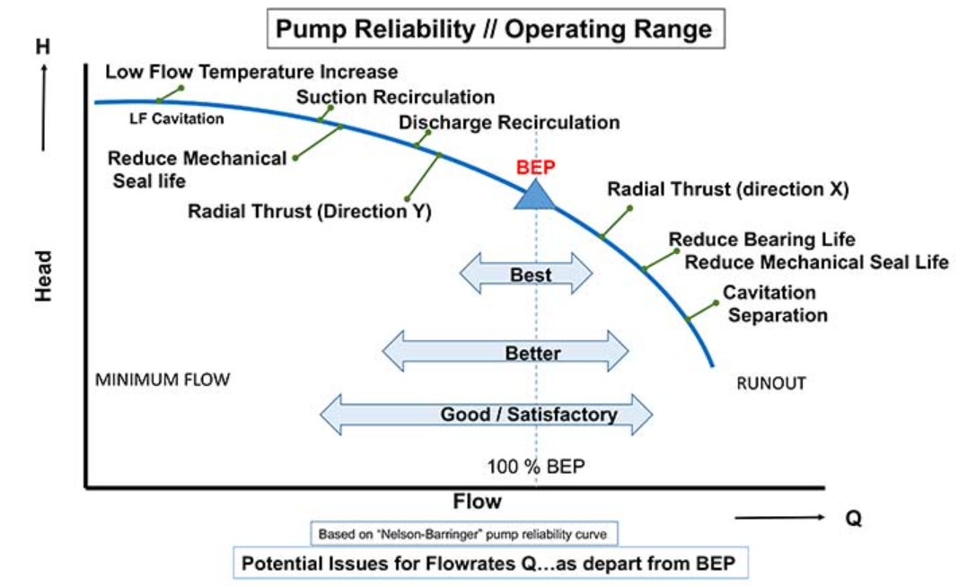 The image above is a typical pump curve showing potential mechanical failures that can occur when the pump operates outside of this +/- 10% operating range. The best efficiency point is where the pump curve intersects your system curve/system requirements. The life expectancy of the pump and or its components will decrease for various reasons when you’re operating outside of this +/- 10% BEP operating range.