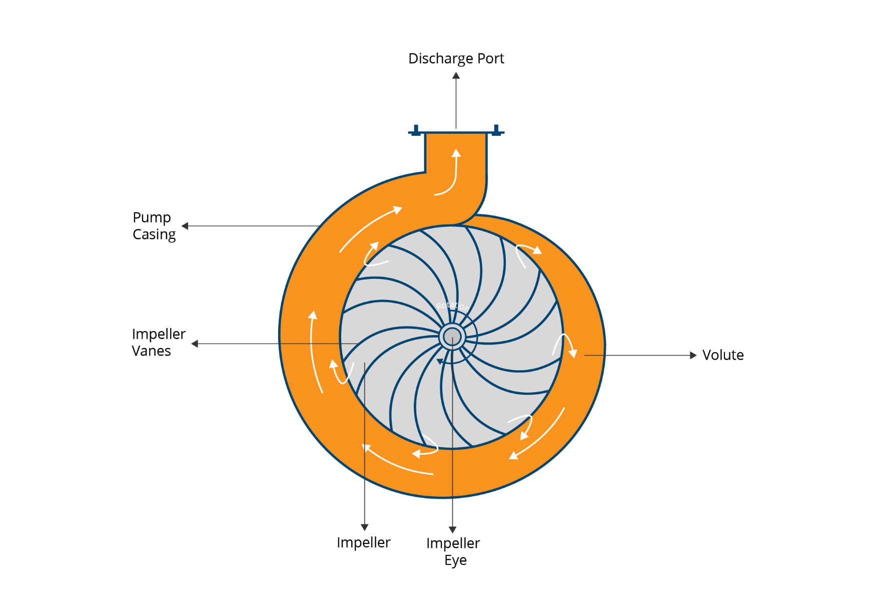 The volute’s spiral shape helps maintain smooth, efficient flow toward the discharge port while minimizing turbulence and energy loss.