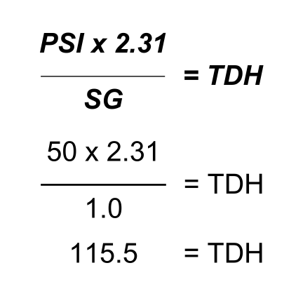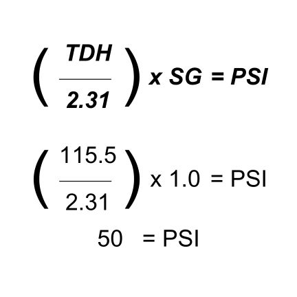 Based on the previous examples, we will use TDH equal to 115.5. If you divide our TDH by the constant 2.31, then multiply that number by our fluids SG (1.0), you’ll find that the pressure your pump will provide is 50 PSI.