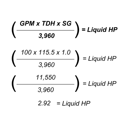 If you need to calculate the horsepower that your fluid is generating at a given flow and pressure, then you need to calculate your Hydraulic (Liquid) Horsepower. To do so, you will need to know your gallons per minute (GPM), TDH, and SG of your fluid.