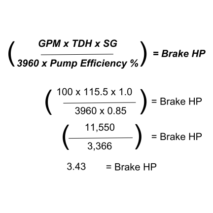 In this example, our GPM is equal to 100, our TDH is equal to 115.5, our SG is equal to 1.0, and we find that our pump’s efficiency is 85%. First, you will need to multiply GPM, TDH, and SG. That total is then divided by the product of our constant of 3,960 and your pump’s efficiency of 85%. This results in our Brake Horsepower equaling 3.43 BHP.