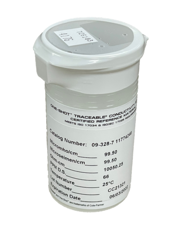 A One-Shot Method is a single-use conductivity standard. This is typically used for general purpose lab equipment, where a single point verification is required. The standard conductivity solution itself is formulated to a predetermined conductivity value at a specific temperature. This method is performed by placing the probe in a one-shot solution and verifying that the readings of the UUT are within the value of the one shot to approve specifications. Adjustments can be made based on the value of the One-Shot standard. Pro Tip:If you are using temperature compensation, use the value on the bottle at 25°C. If you are taking a non-temperature compensated measurement, use the certificate of analysis that comes with the standard solution |
